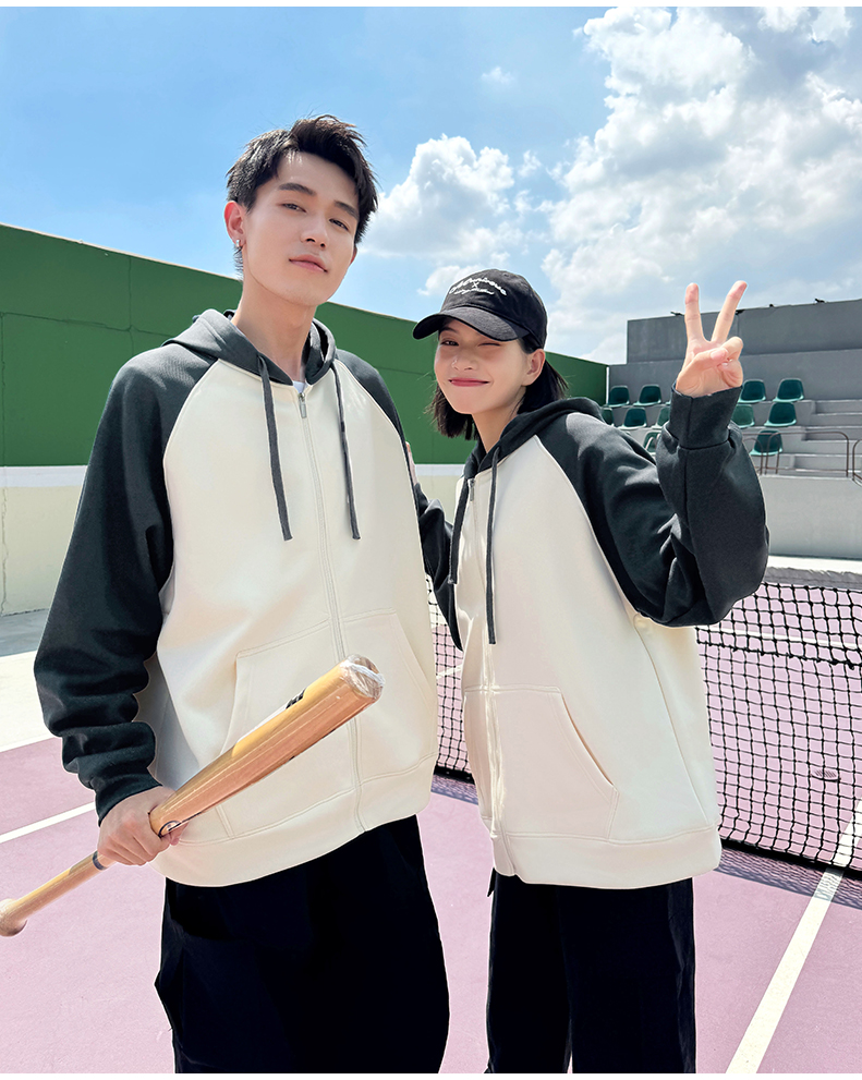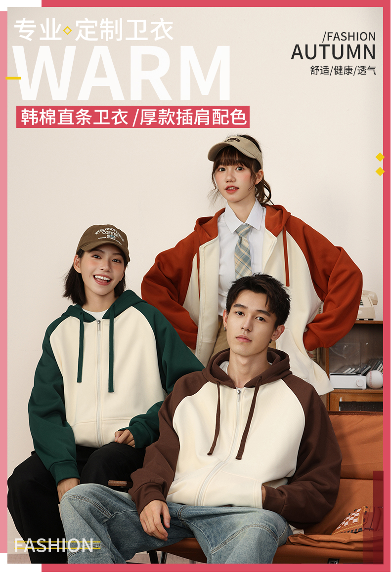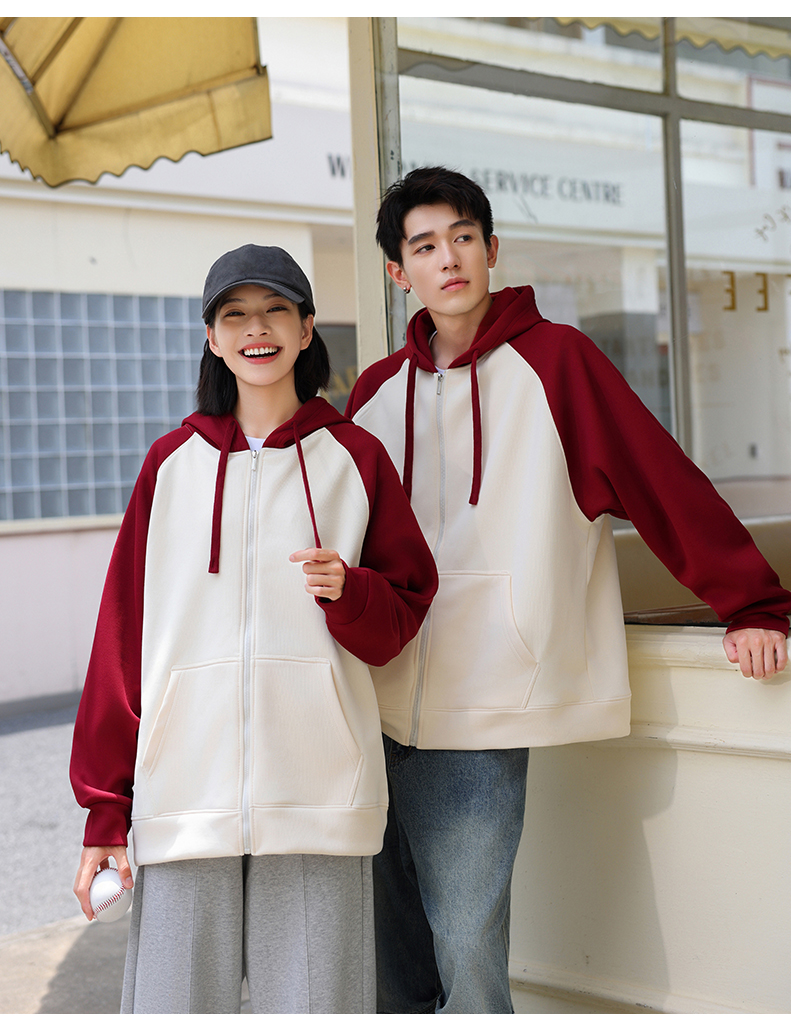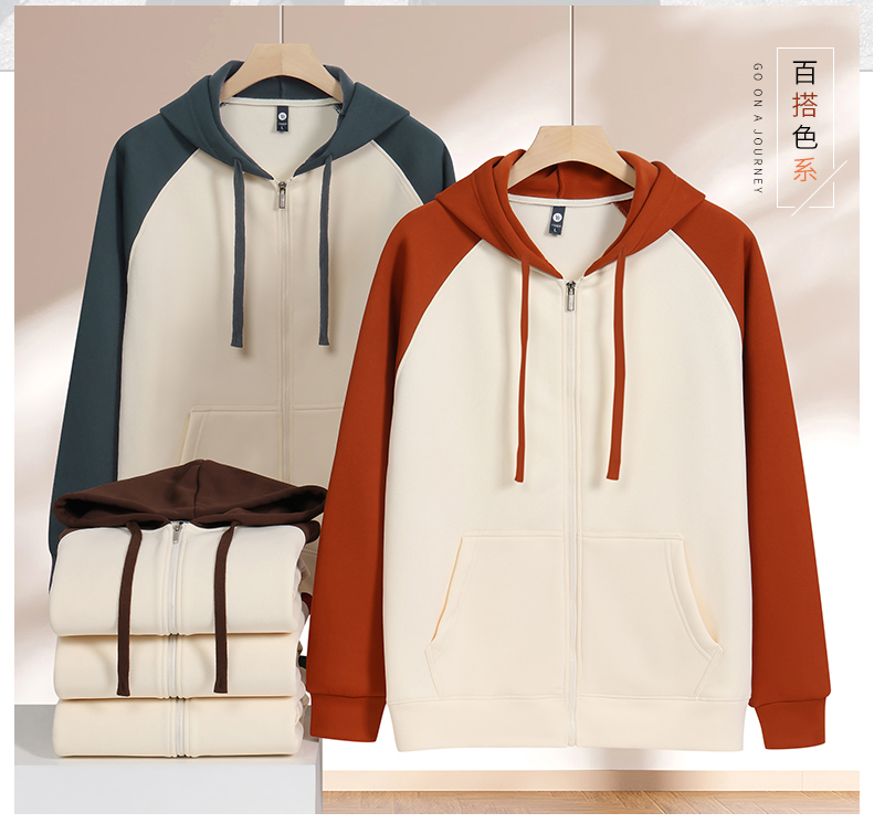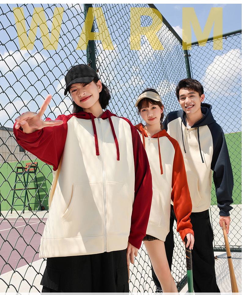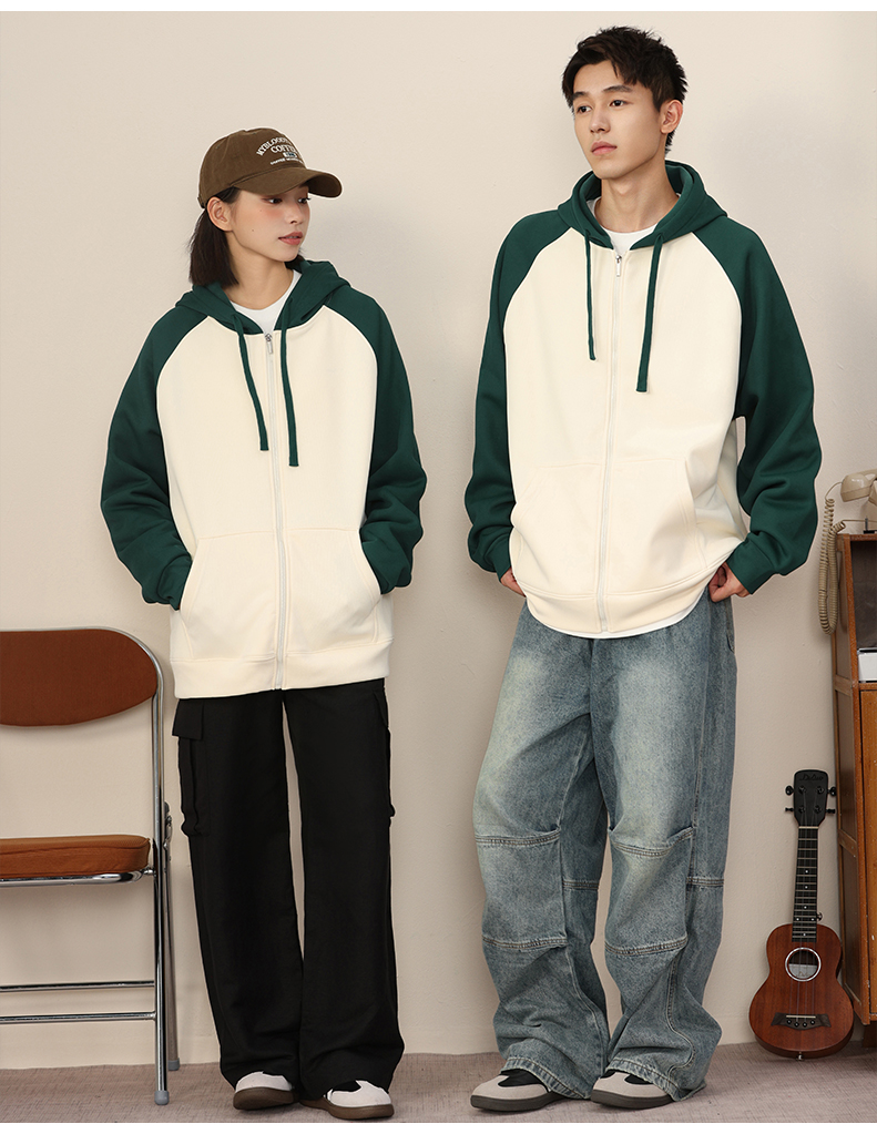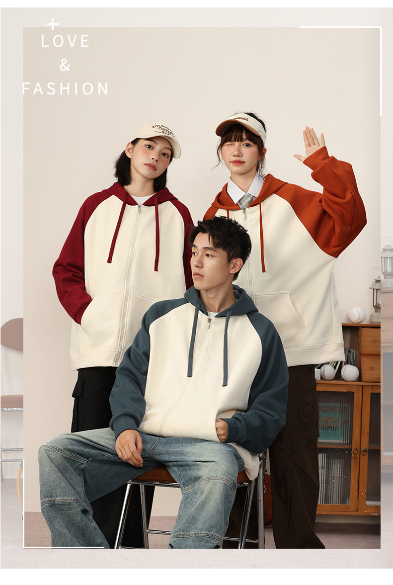 450克加绒厚款宽松插肩袖拼色连帽拉链卫衣定制