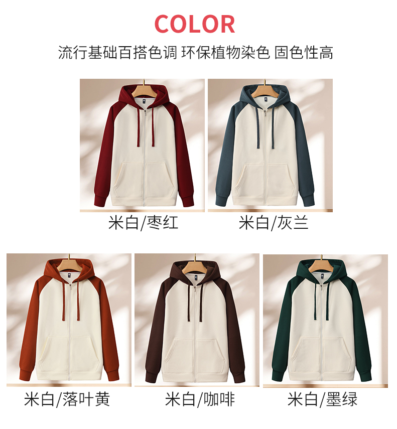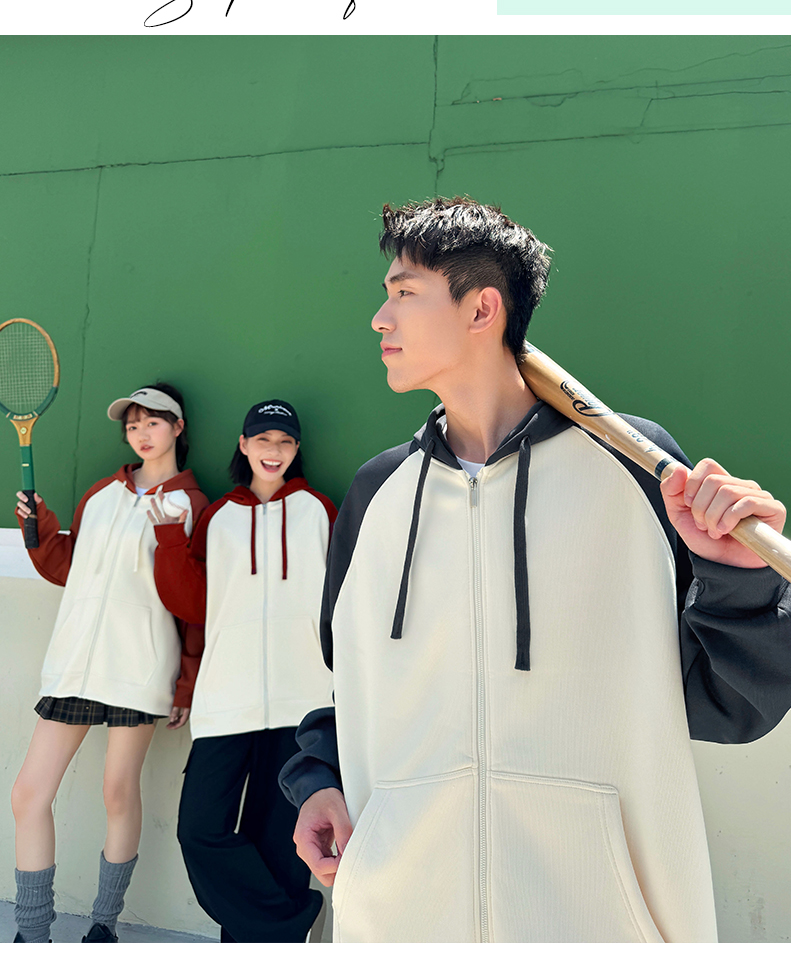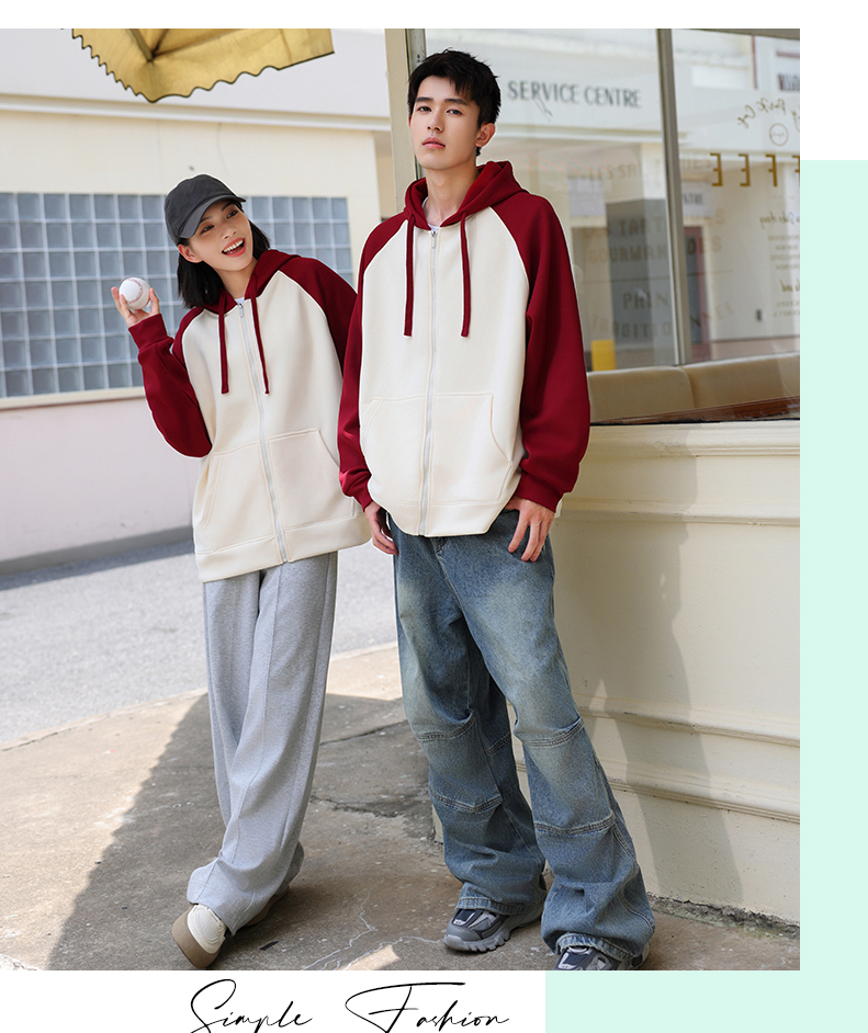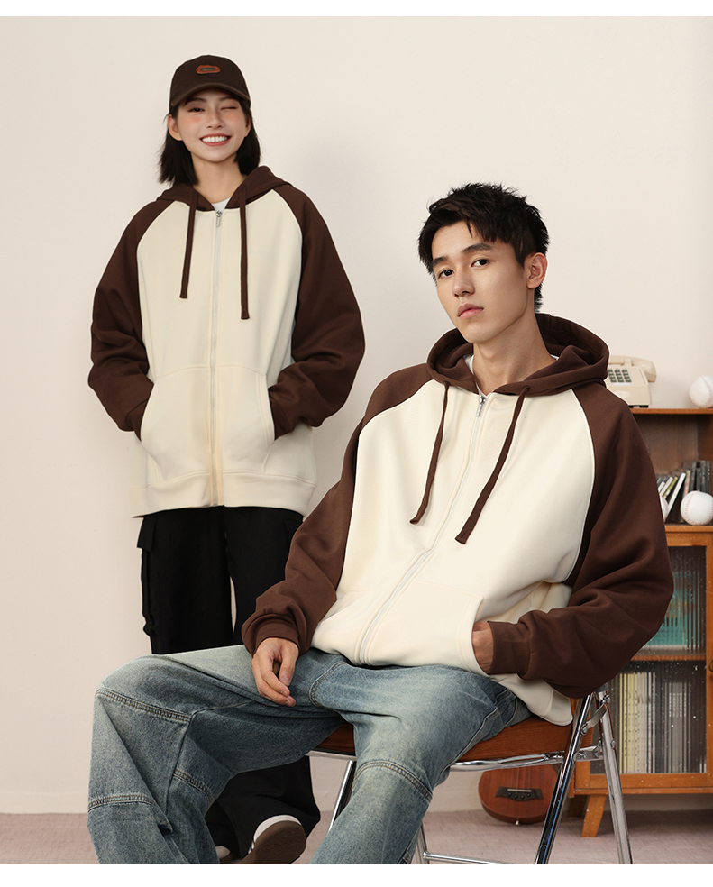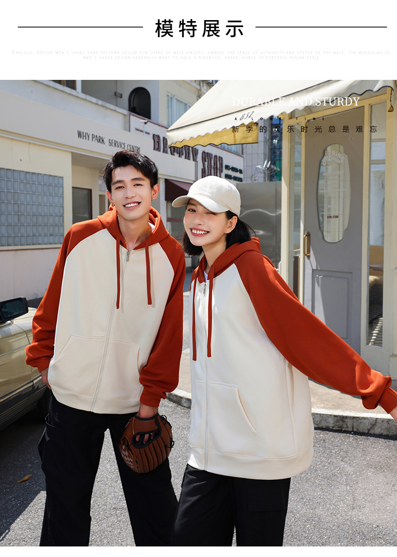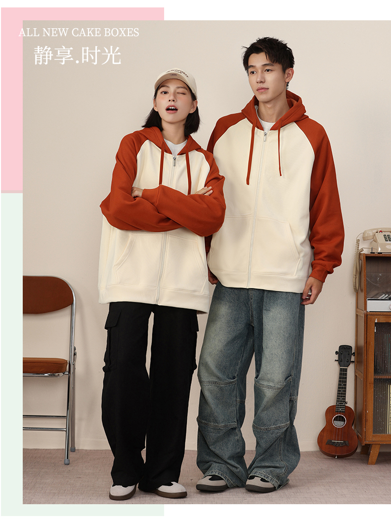 450克加绒厚款宽松插肩袖拼色连帽拉链卫衣定制